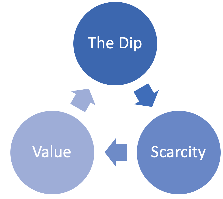 I read The Dip: A Little Book That Teaches You When to Quit (and When to Stick) by Seth Godin. The Dip is the long stretch between beginner's luck and real accomplishment. It is the long slog between starting when it is exciting and fun and mastery. Only the people who invest the time, energy, and effort can power through the Dip. In economical terms, the supply of these experts is scarce so they are of high demand. The Dip creates scarcity which creates value.