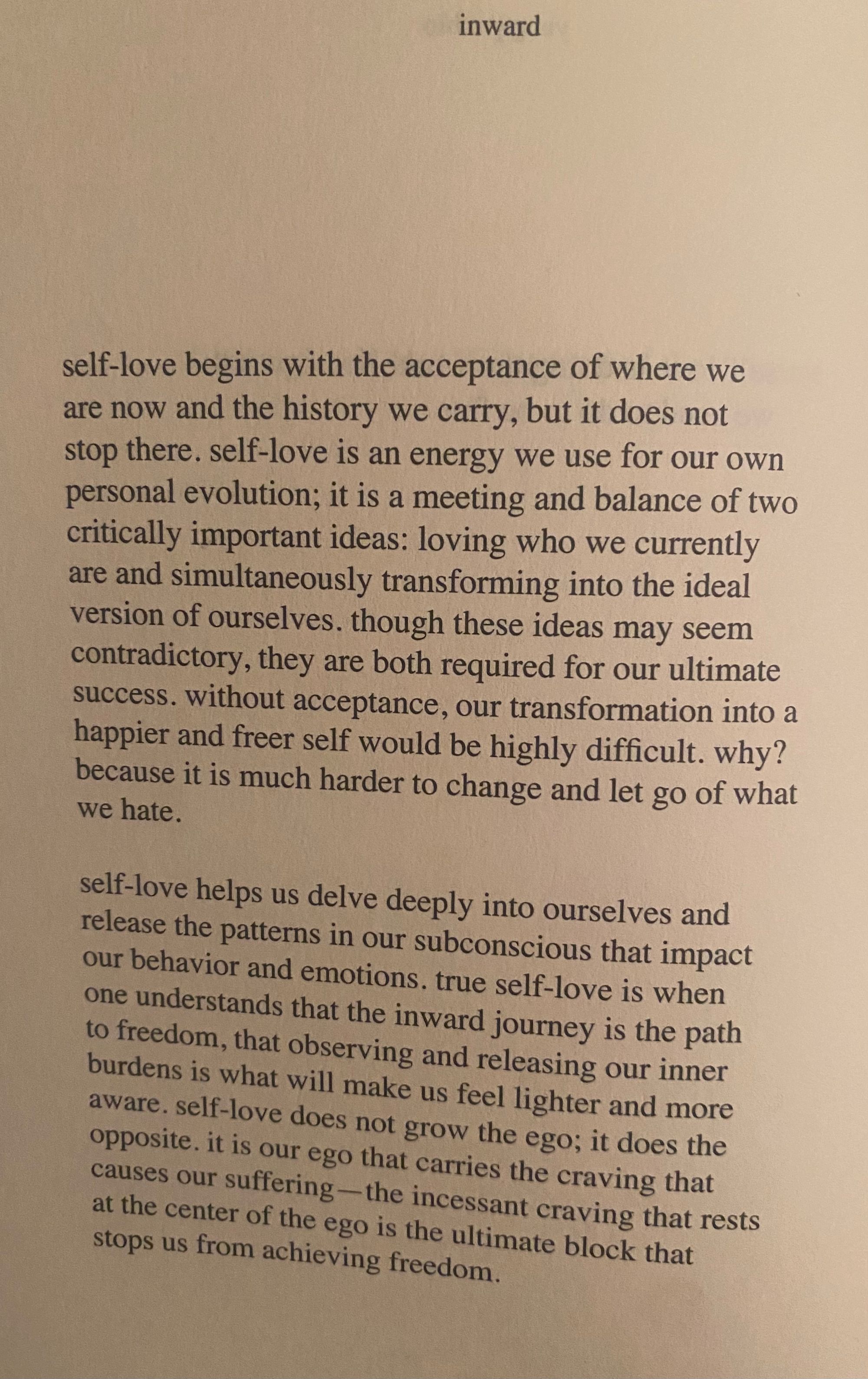 A whole entire chapter is dedicated to the concept of self-love. The line that stands out to me most is “loving who we currently are and simulatenously transforming into teh ideal version of ourselves.”