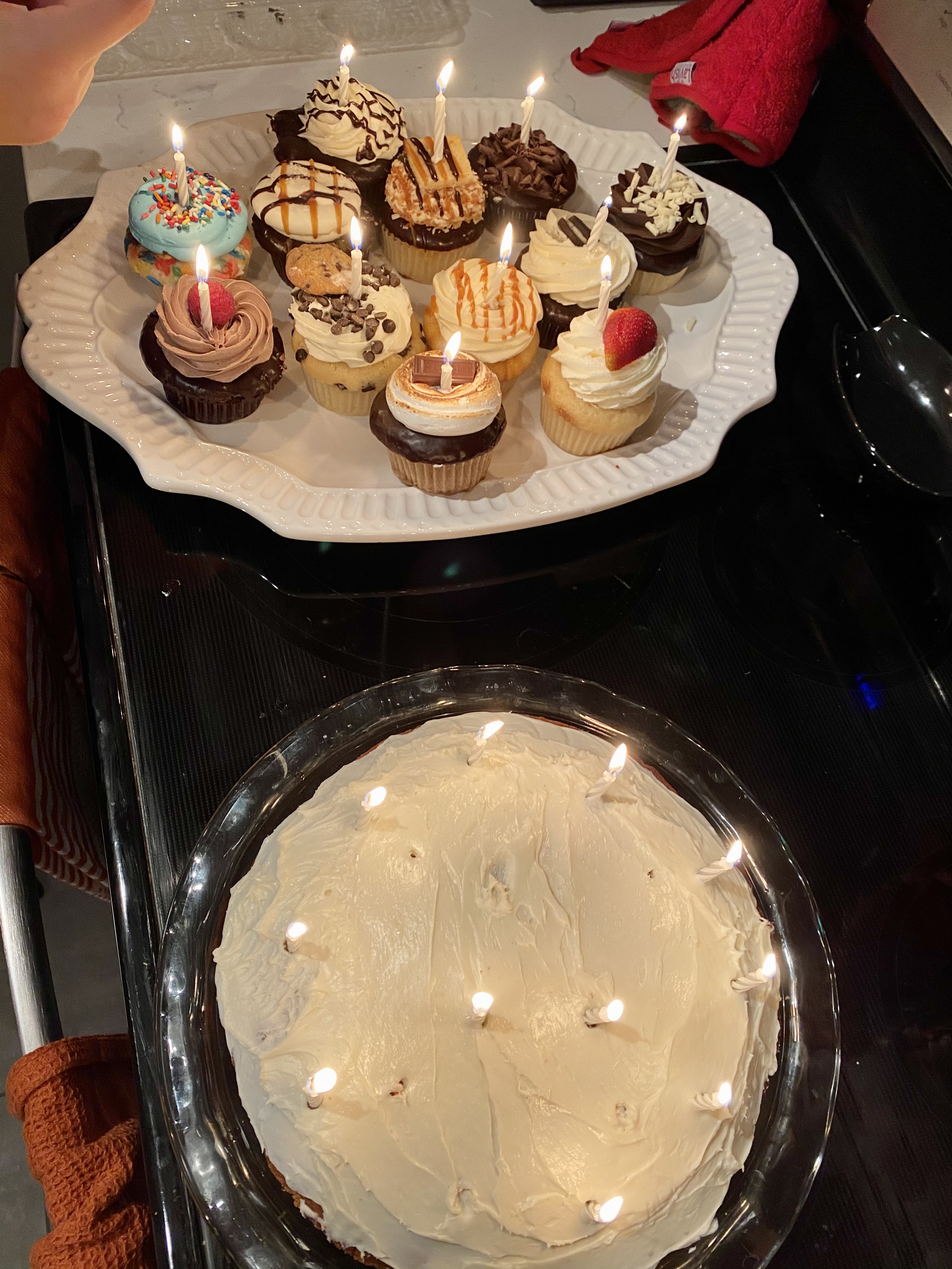 (vanilla cake with Maraschino cherries) for a friend's birthday. I had never been so precise with using a recipe. It sounded iffy that it called for 7-Up pop but I followed the rules anyway. Here's the after picture (accompanied by some beautiful store-bought Molly’s cupcakes).