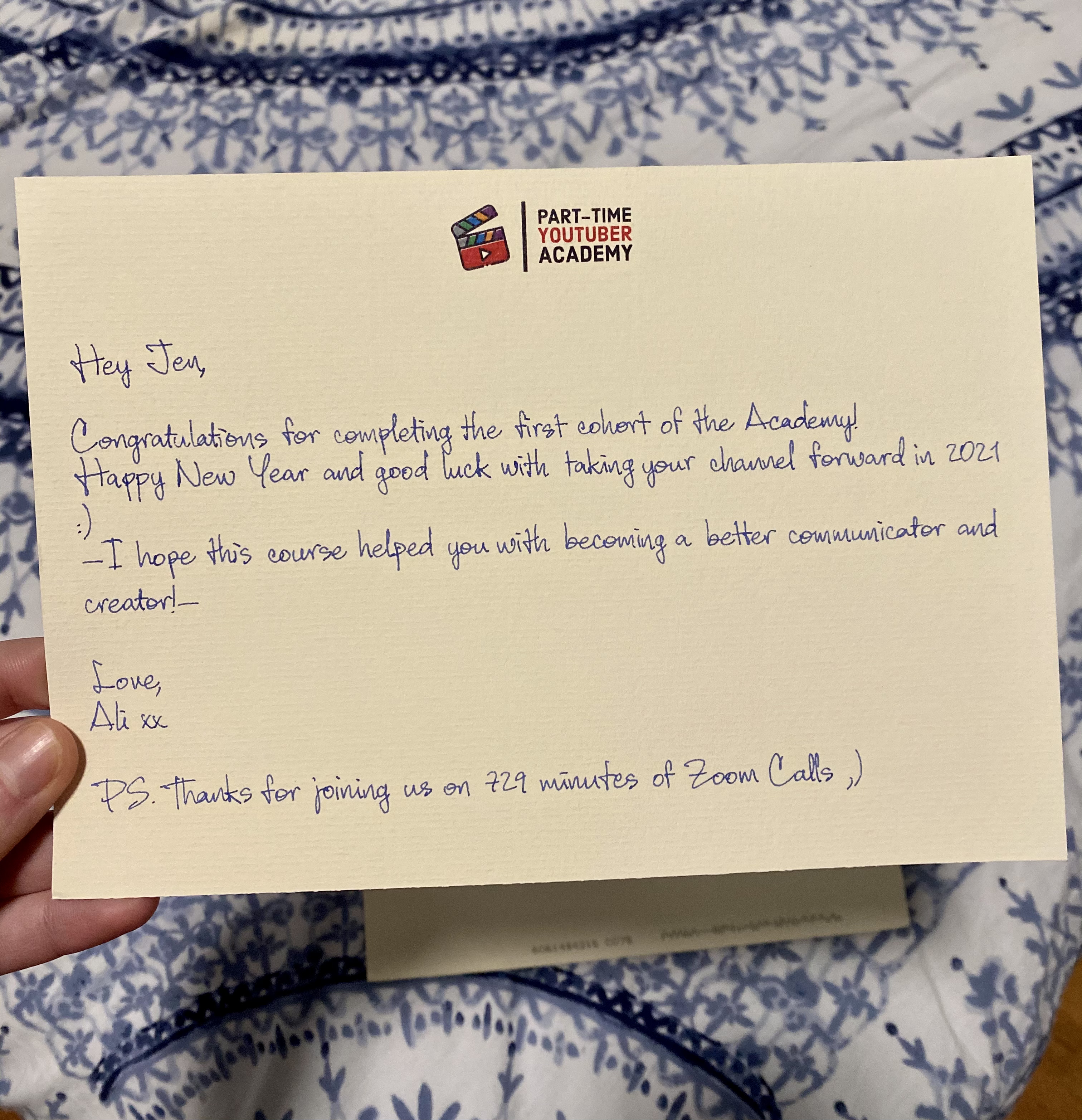 Ali Abdaal sent me this handwritten note after the Part-time Youtuber Academy ended last year. I am beyond impressed that he sent me this from Cambridge in England! Talk about stepping up the game of a stellar online course student experience where there were 400 students in the community.