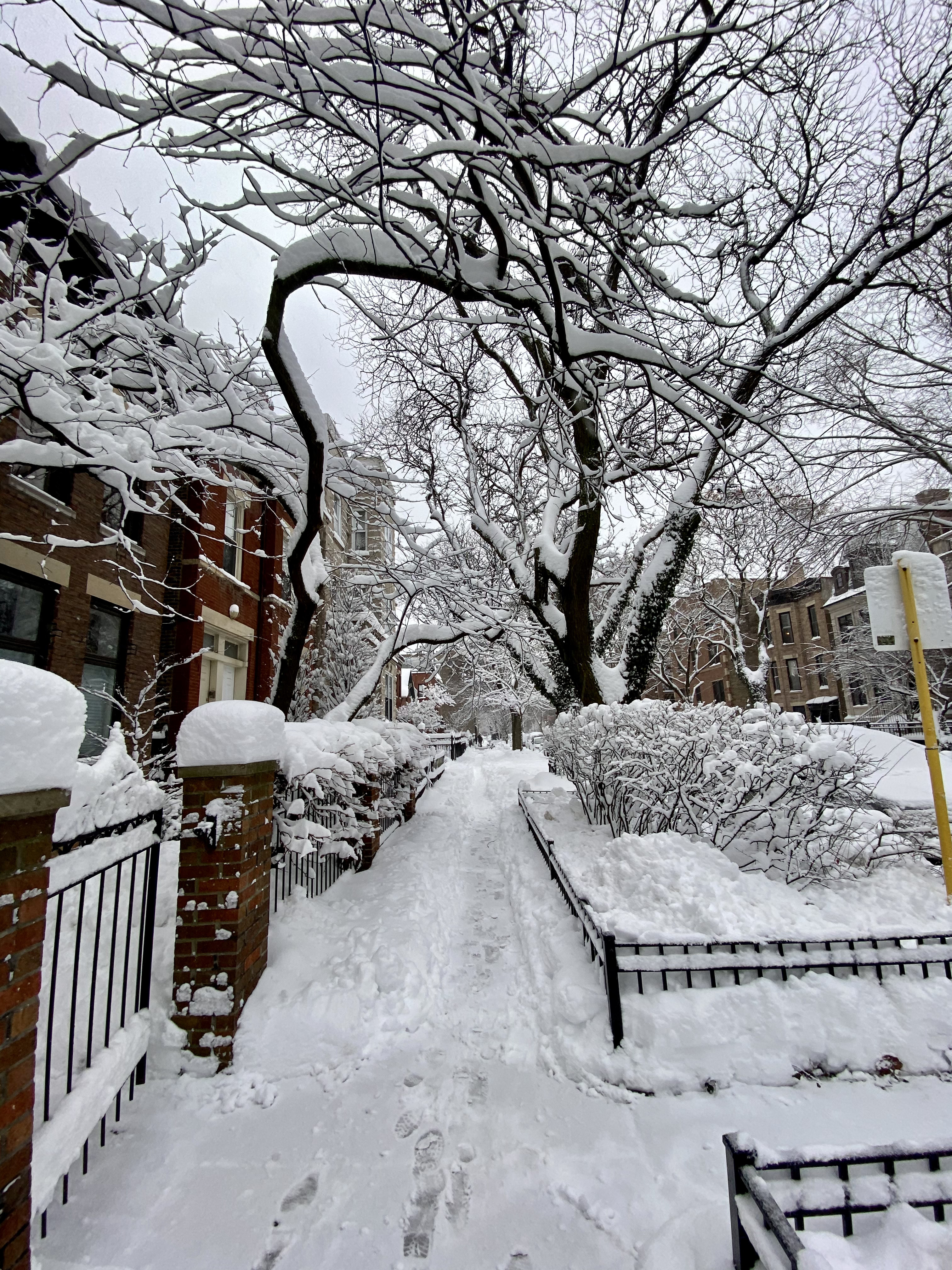I've been taking my morning strolls lately and love how quiet it is. I can see the fluffy flakes slowly fall. I see sled marks of the kids from the day before. The snowmen droop down probably named Olaf. I spot a tiny mitten that accidentally got left behind and flew out of a pocket. It's as if I am people watching without there being any people at all.