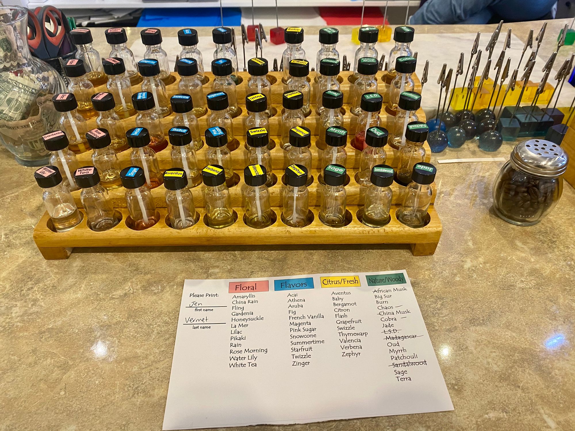 I wanted to do something new for my birthday, so why not get in touch with my nose?! I smelled 30 different scents. They were split across different categories of floral, flavor, citrus/ fresh, and nature/woody. You had to trust your split reaction of whether you like the scent or not. It was like a lightning round of how well you knew your nose. I smelled all of them and circle your top 10 and the perfumers mix them to see which ones are the most complimentary. They narrow it down to three and then I choose.