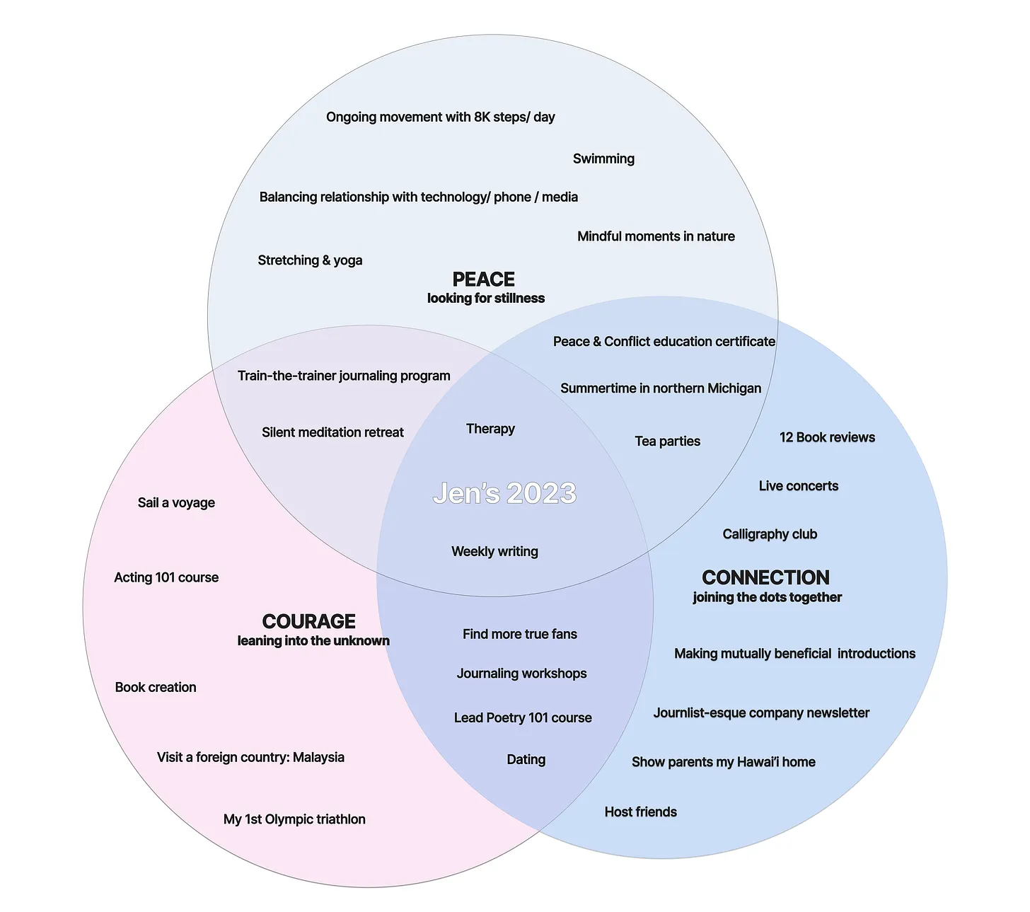 In 2023, Peace, Courage, and Connection were my three words. This was the mockup I created last year that helped me converge on these three themes: