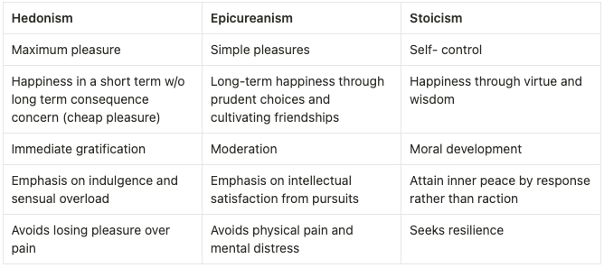 What are the differences in the philosophies of epicureanism, hedonism, and stoicism? Here’s a summary I created from a few rabbit holes I enjoyed going down: