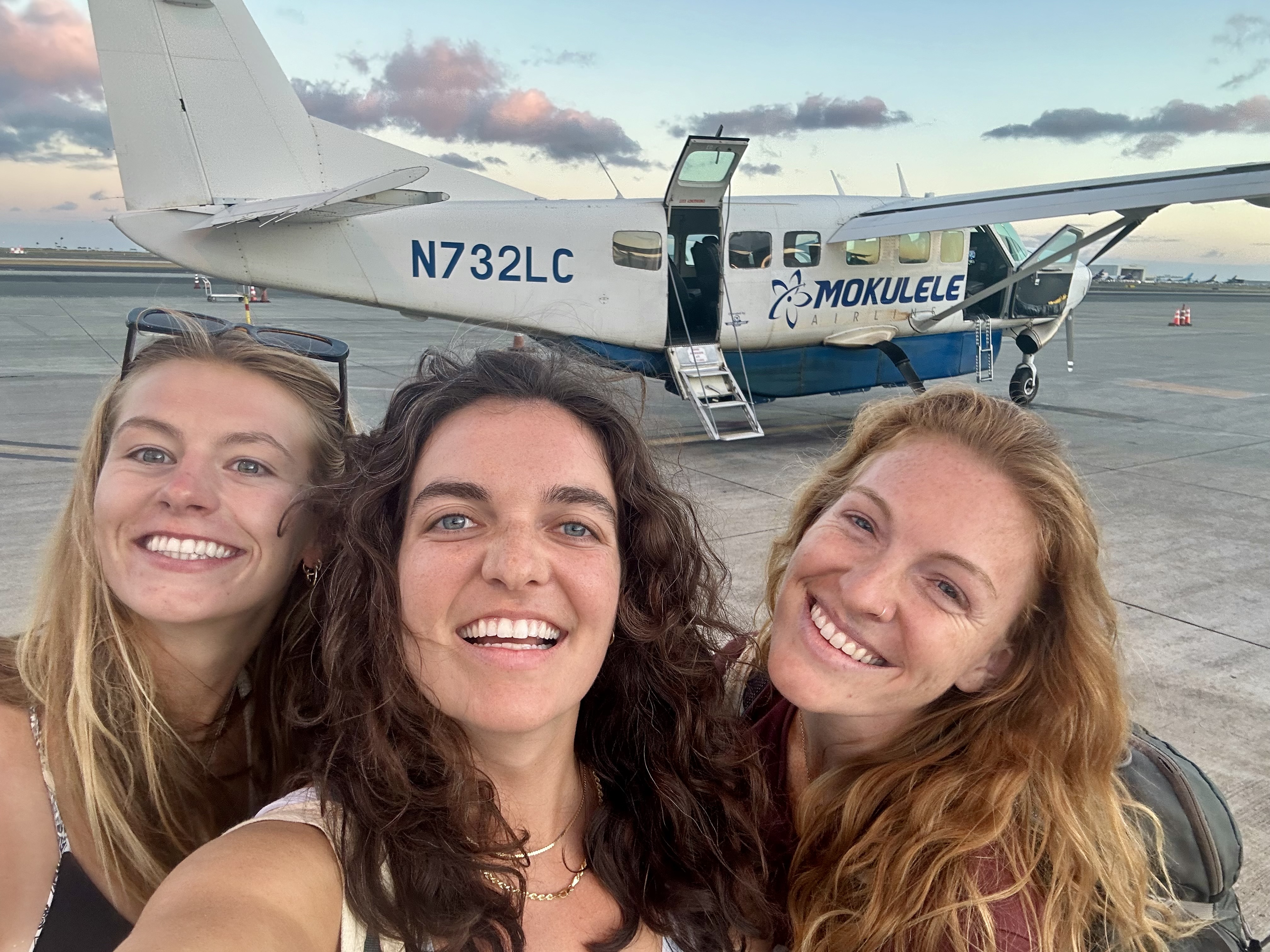 A blonde, brunette, and ginger get invited to a neighboring island for the weekend. They fly with seven others on the island hopper, eat a bunch of sweet bread, get invited to a rager at an elementary school, dip in a couple of waterfalls, hear a manâs radical views on airships, scope out the leprosy colony, play cards at the pizza cafĂ© and fly back home.