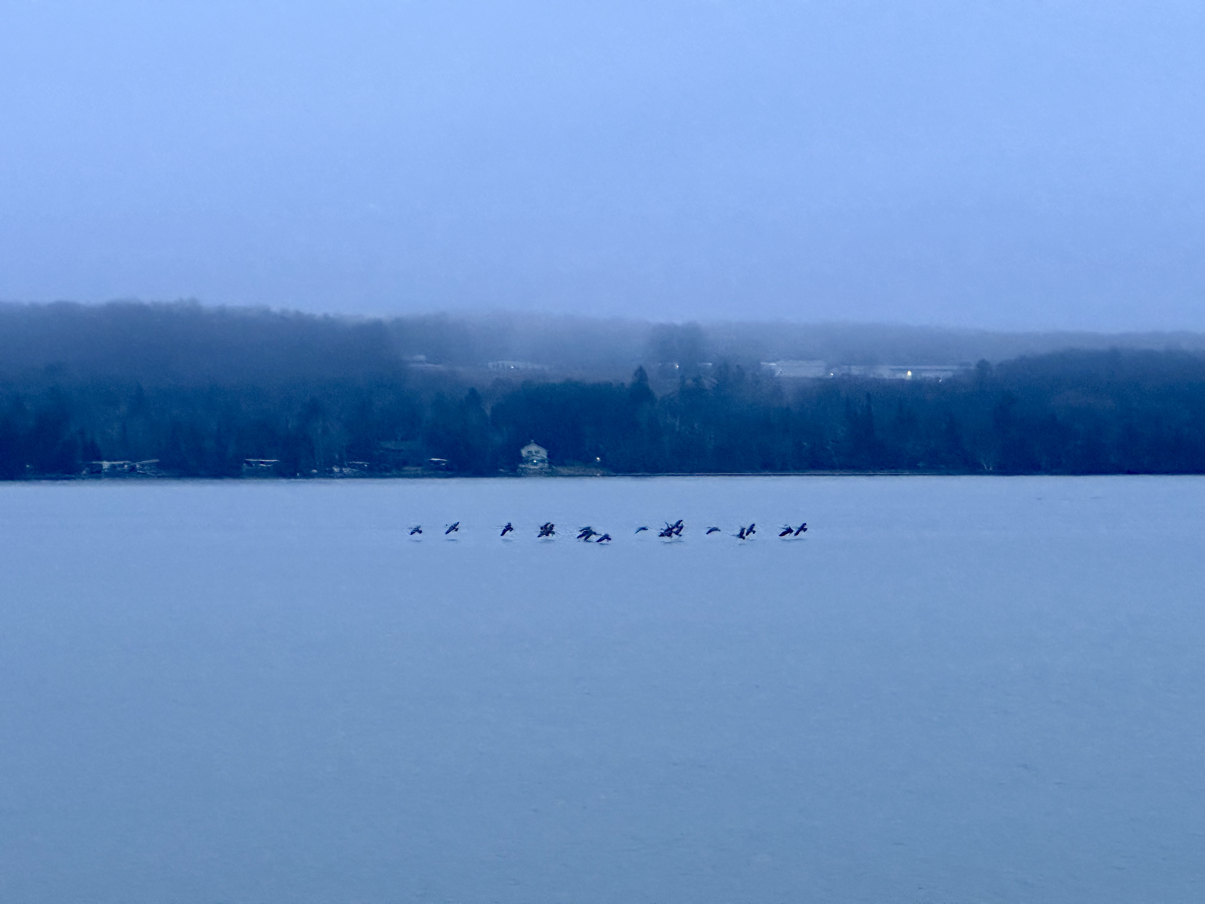 Above is a school of geese about to rest on the lake. Usually this time of year it’s ice but I’m glad they get to go for a refreshing dip. Not pictured above are the massive bald eagles with white heads and deep yellow beaks that I saw soaring over the lake. It looked like they were looking for something to eat, like my fluffy gray cat. Not today my the national emblem friends.