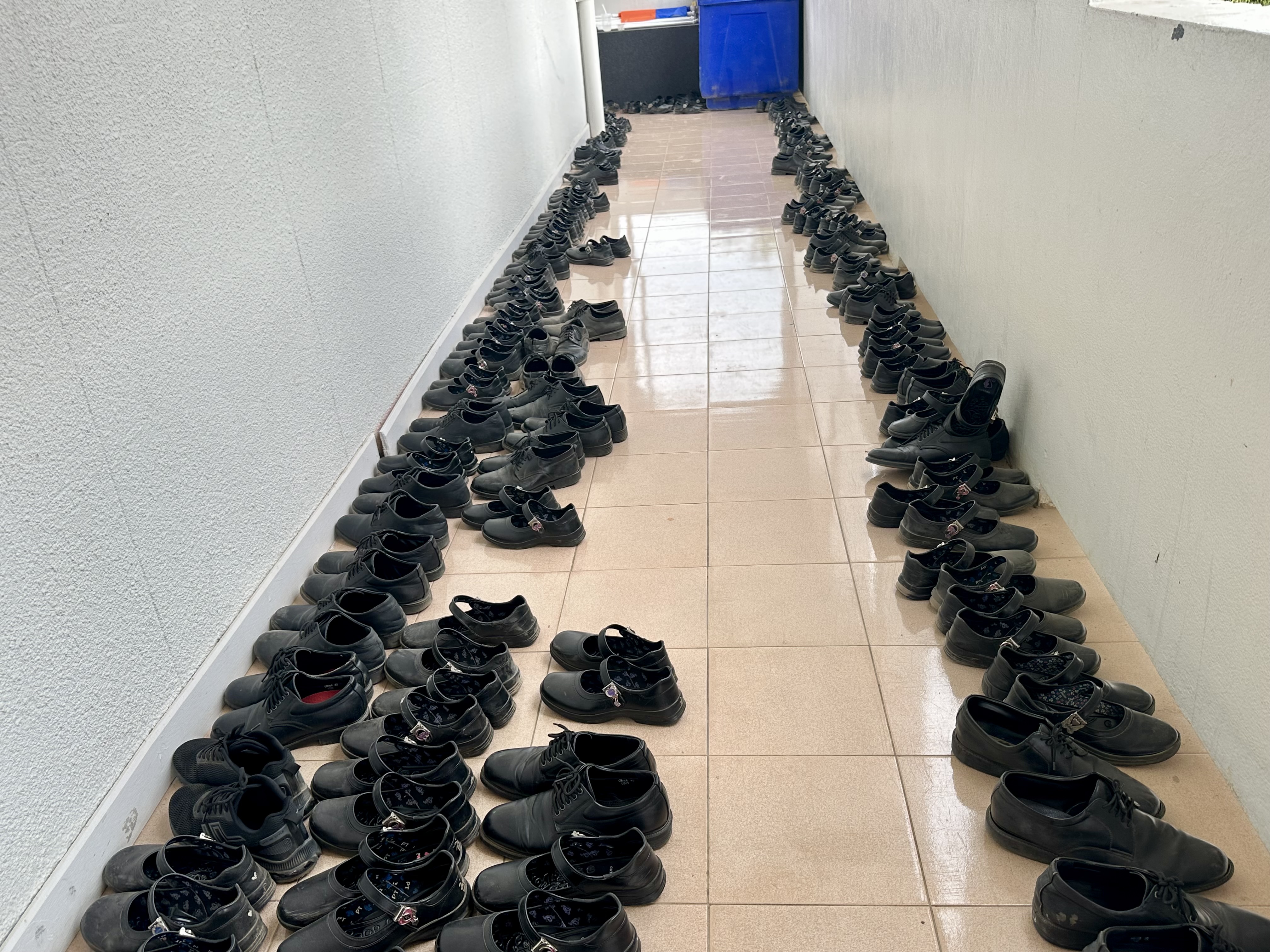 - Students never wear shoes in school. Only from building to building. These always crack me up outside of the rooms.