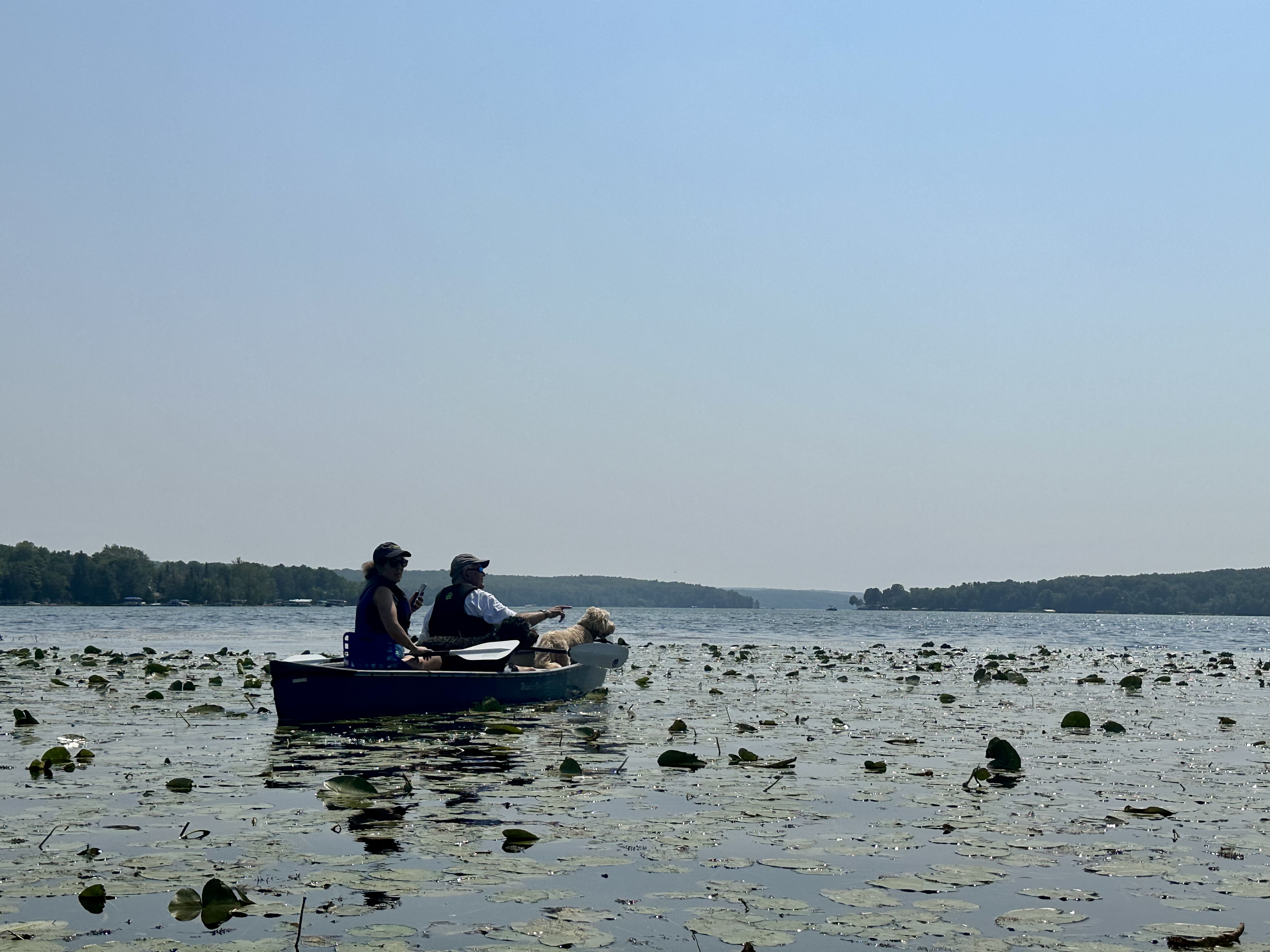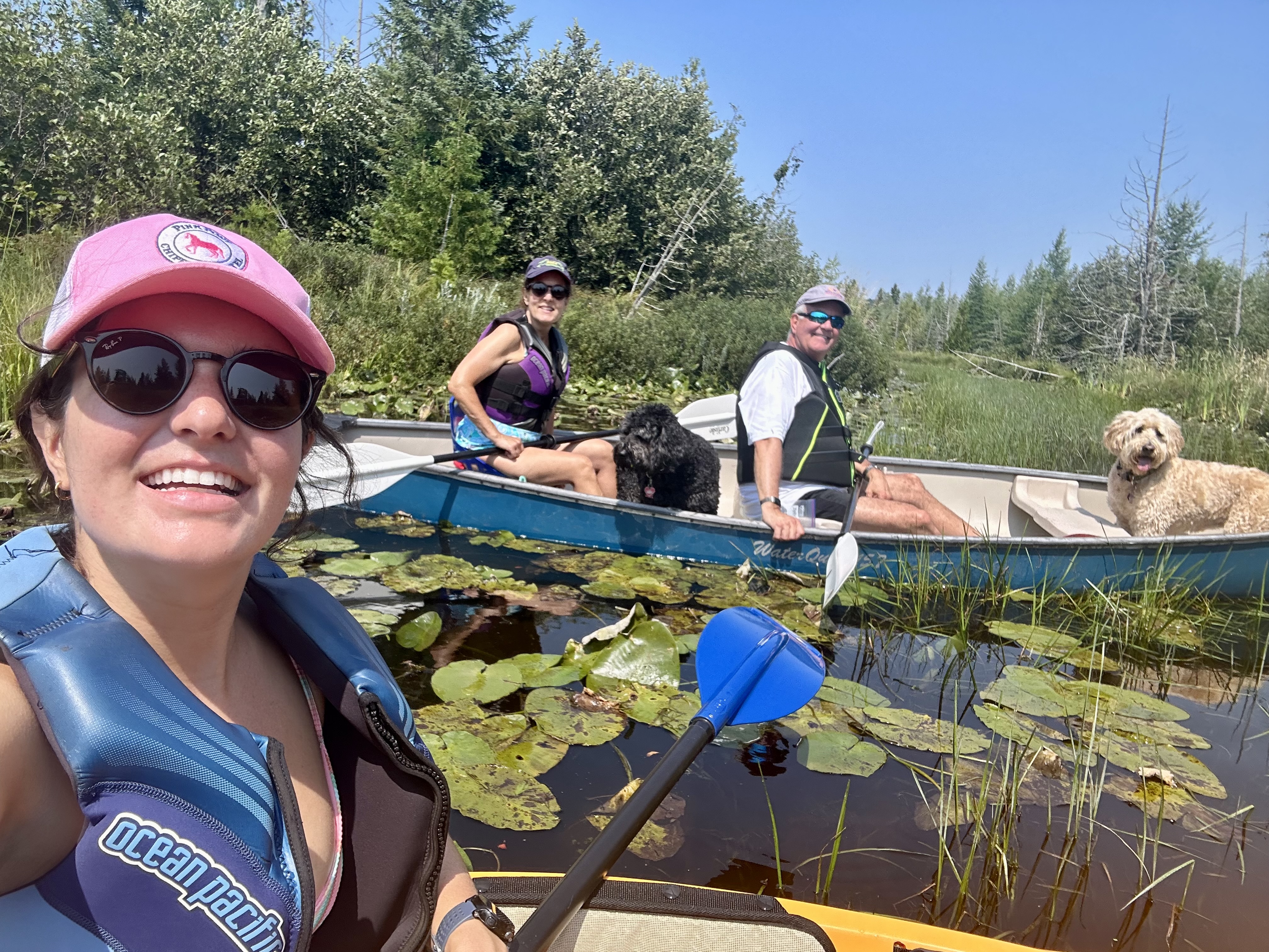These are my parents paddling away with their two doggies stalking a couple of huge blue heron birds in the turtle creek on Walloon Lake after 34 years of marriage.