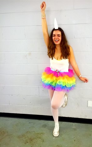 19-year-old Jen was creative enough to go to the craft store and carve out a unicorn horn of styrofoam with a Cutco steak knife and glue it onto a headband. She loved any chance to wear vibrant colors, so it was a great excuse to wear this rainbow tutu to feel like a dancer again, even though she was always a back-row ballerina. She loved how practical Converse shoes were to clean later.
