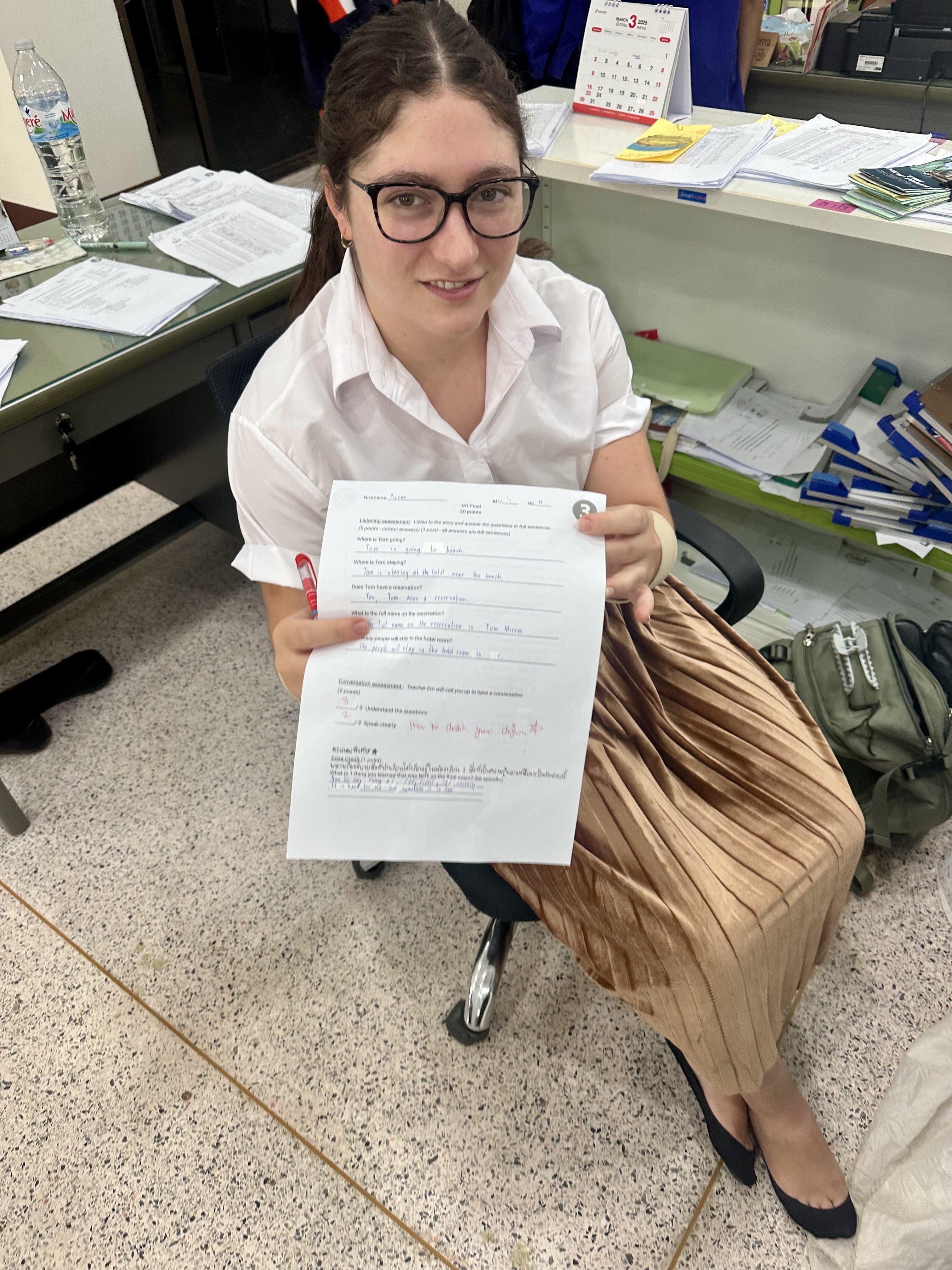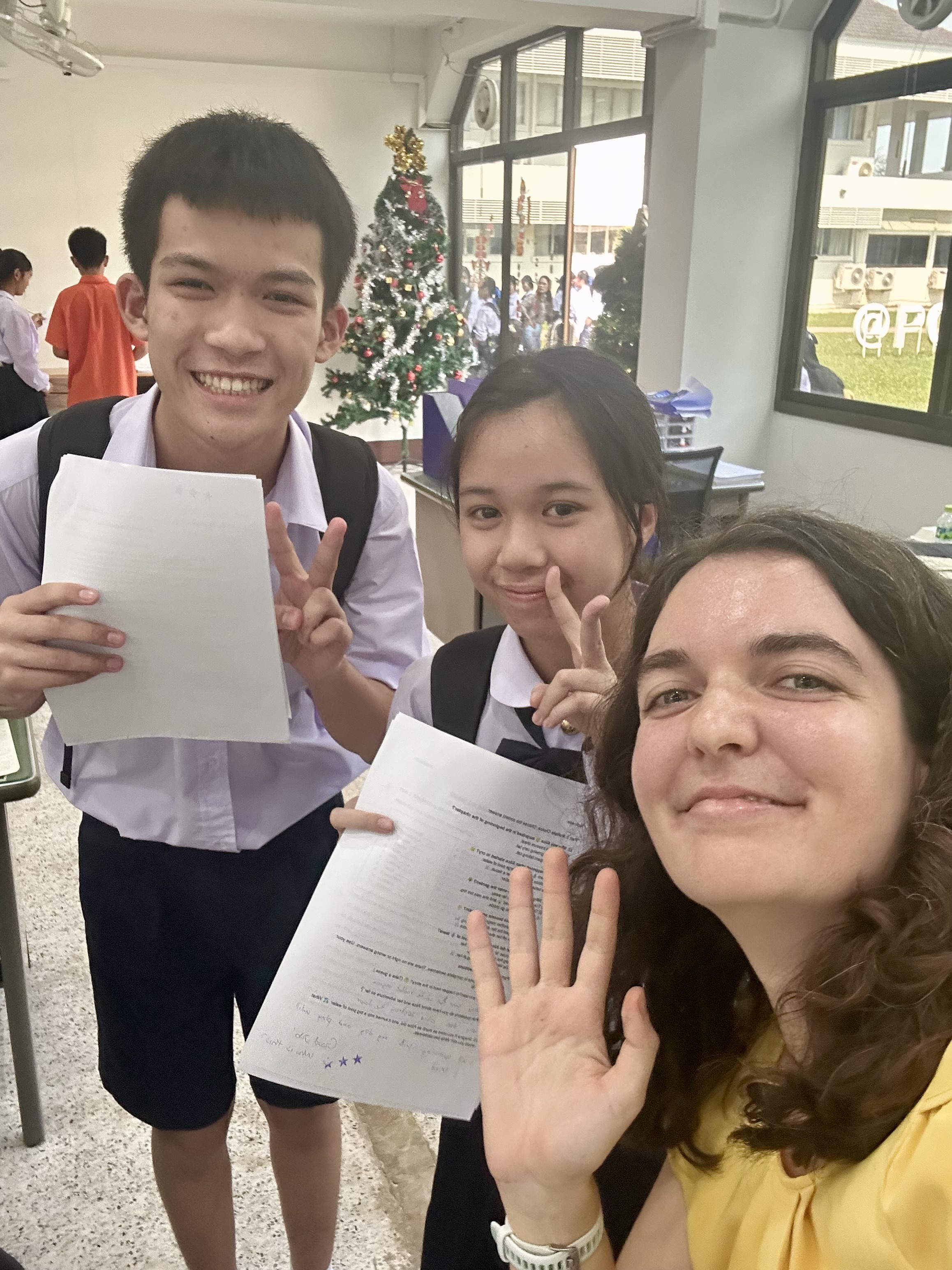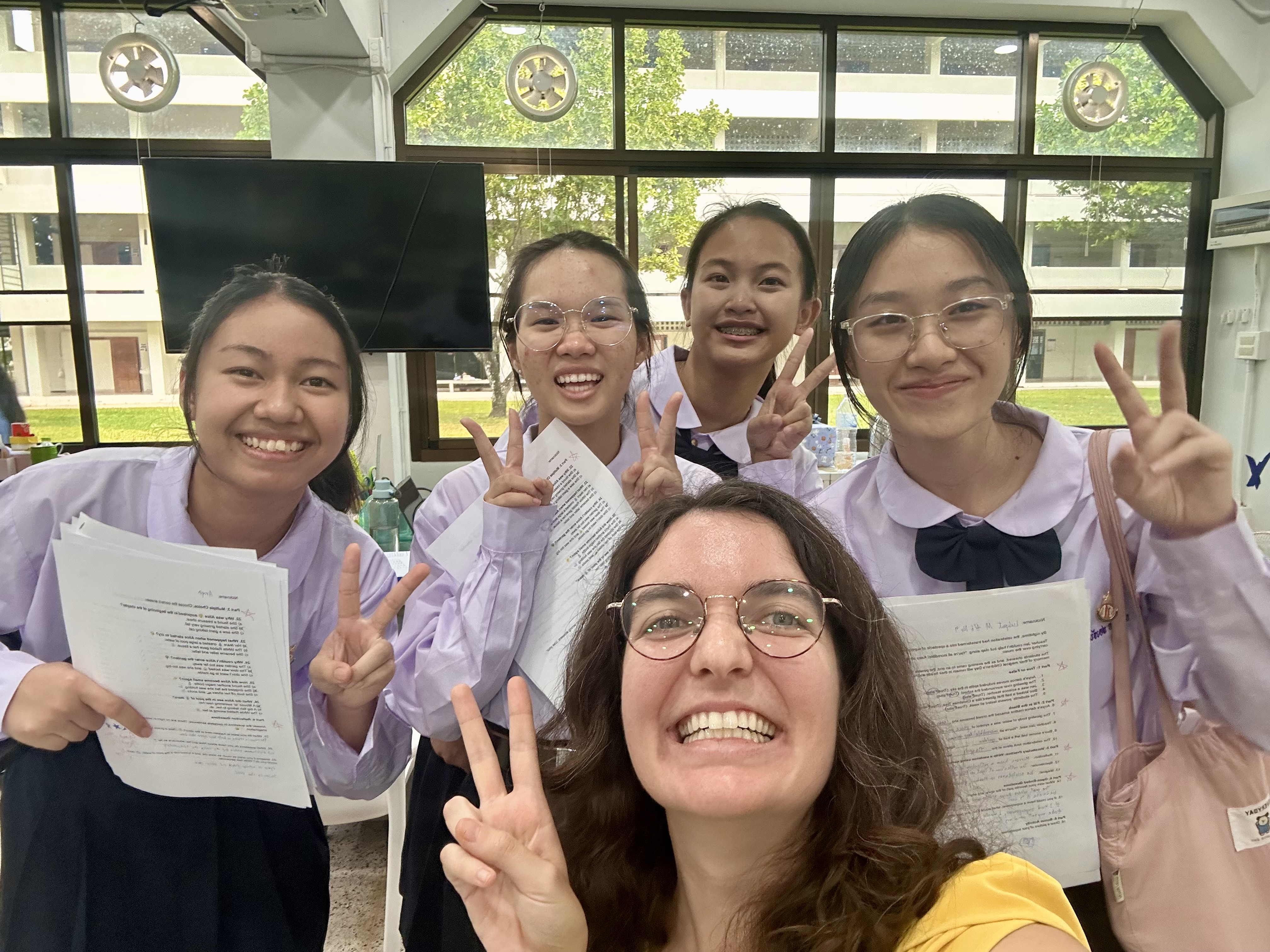 Photographed are Tonnam and Planin after we listened and sang to their favorite Adele and Lana Del Ray songs. Some take away afternoon pick-me-ups from my favorite barista that I order in Thai.. P and Kaimook who love reading Aliceâs Adventures in Wonderland with me. Panna and her future me letter to 2030.My last suki lunch from the canteen. Ing, Nicha, Ning, and Lukpat picking up their graded worksheets. Kru Emily pointing out that I misspelled âHow to train your Dragonâ while grading her students listening skills. A selfie with a gardenia I found on my walk home from school. My dadâs favorite flower.