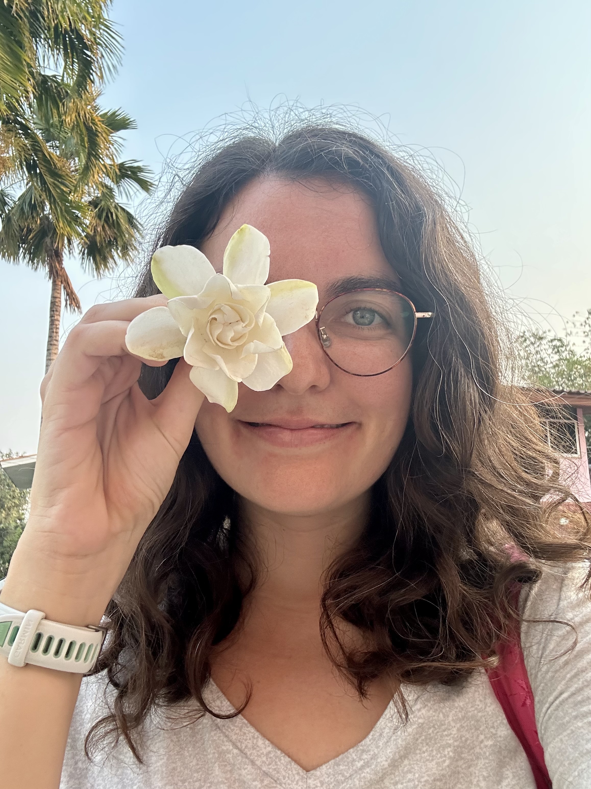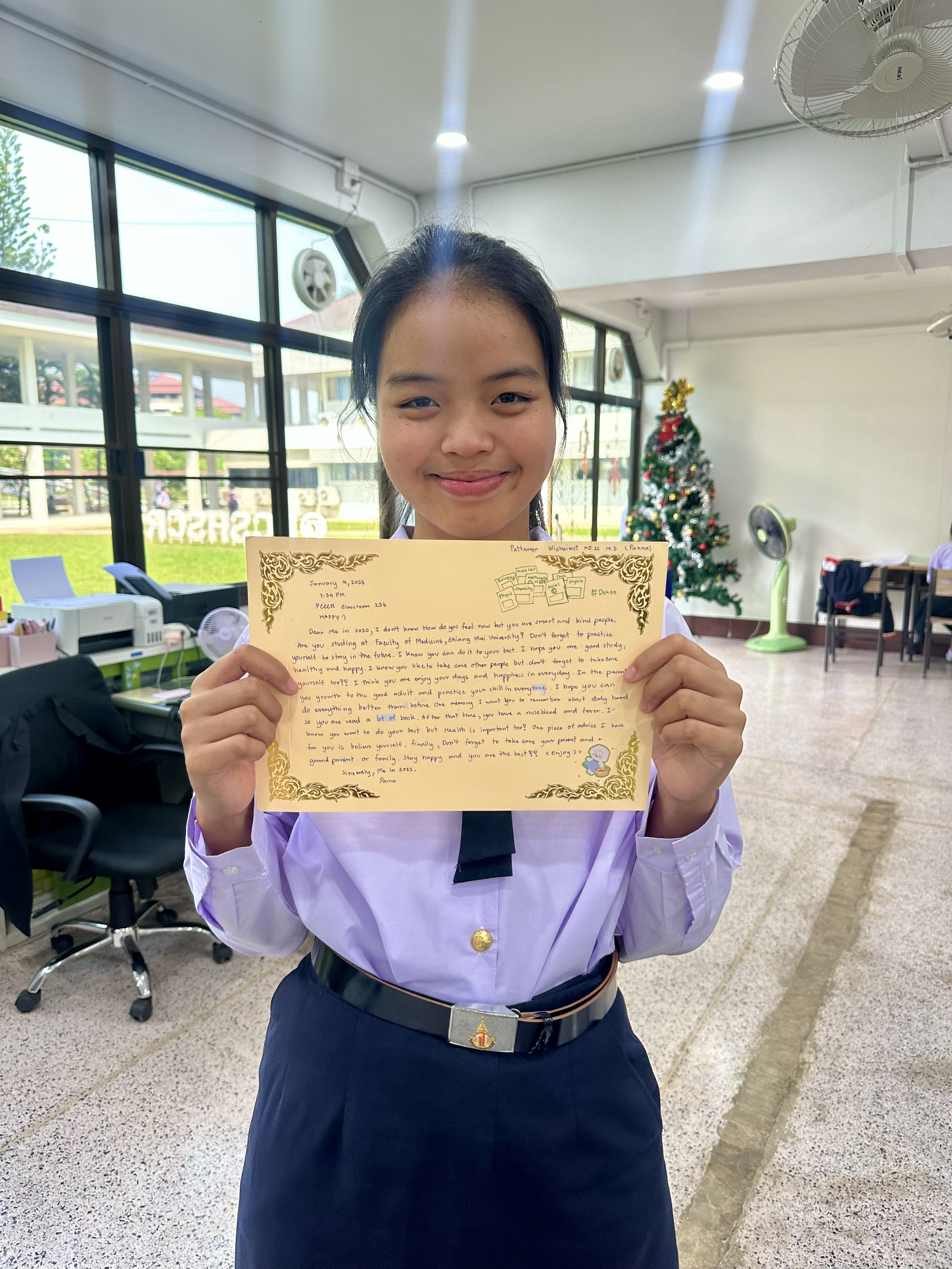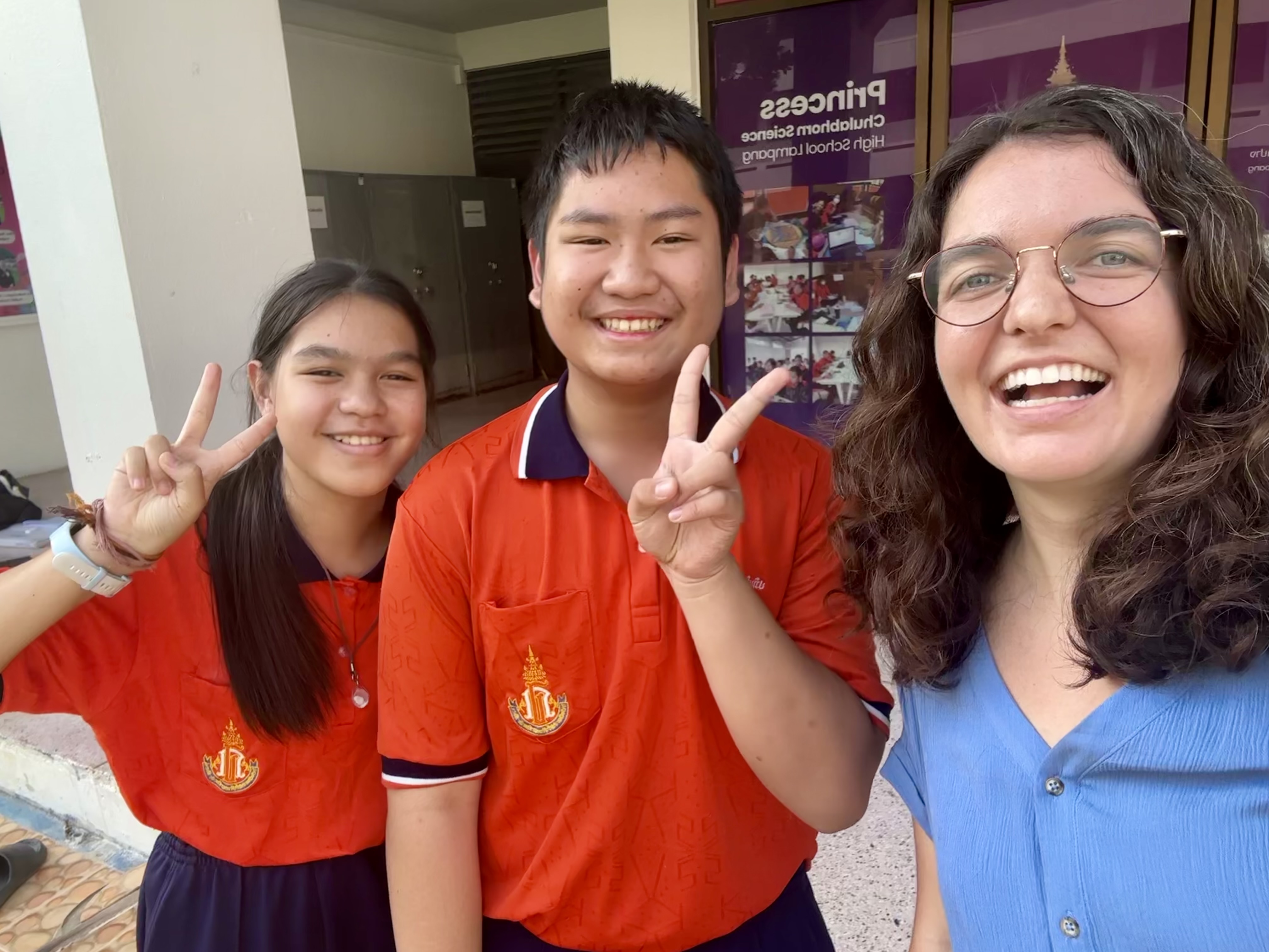 Photographed are Tonnam and Planin after we listened and sang to their favorite Adele and Lana Del Ray songs. Some take away afternoon pick-me-ups from my favorite barista that I order in Thai.. P and Kaimook who love reading Aliceâs Adventures in Wonderland with me. Panna and her future me letter to 2030.My last suki lunch from the canteen. Ing, Nicha, Ning, and Lukpat picking up their graded worksheets. Kru Emily pointing out that I misspelled âHow to train your Dragonâ while grading her students listening skills. A selfie with a gardenia I found on my walk home from school. My dadâs favorite flower.