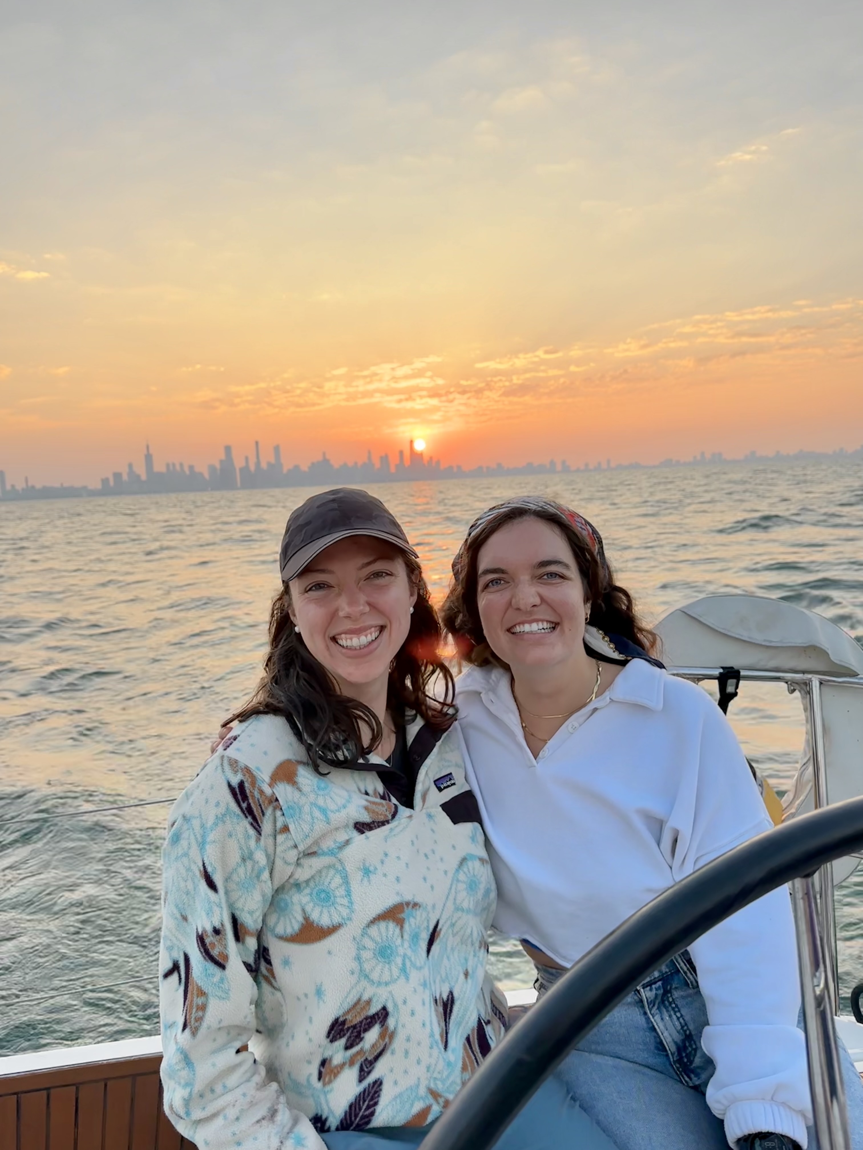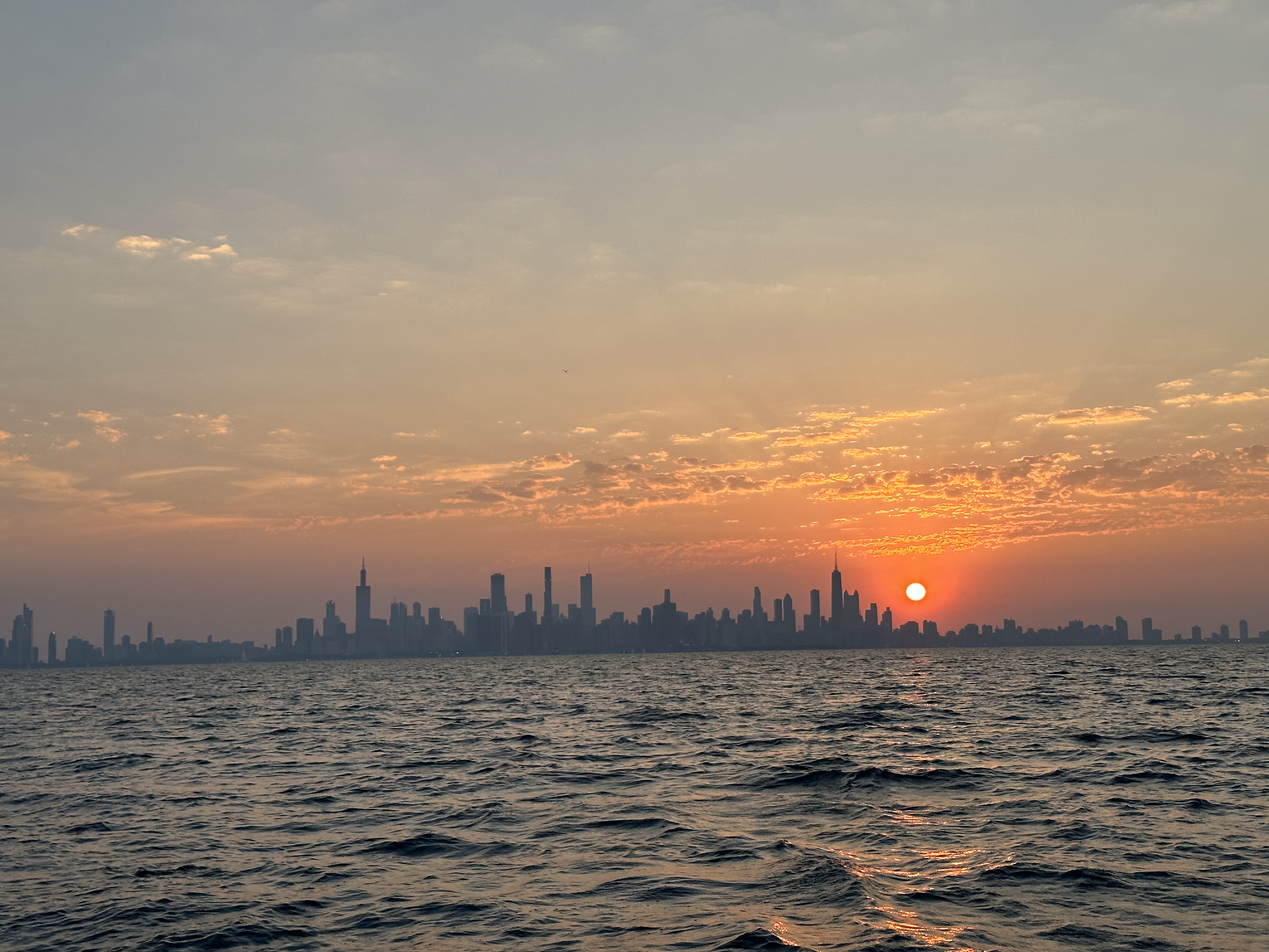 The right shot was taken last night while sailing on Lake Michigan outside of Chicago. This is after our 8-hour road trip with fun stops like eating sandwiches in a Dollar General parking lot next to Lake Cadillac and for cheese, black licorice and ice cream in Holland, Michigan.