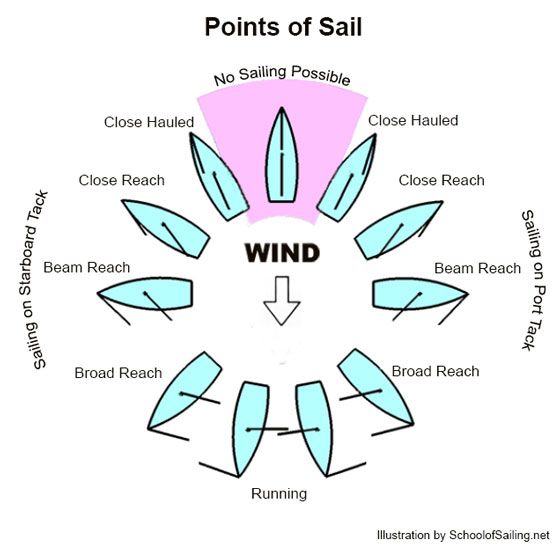 Personally, my favorite point of sailing is 90 degrees from the wind at a “Beam Reach”. This is the fastest and easiest point of sail. The wind is on the side of your boat at the beam with the sails out halfway. This makes it a rather boring beam reach.