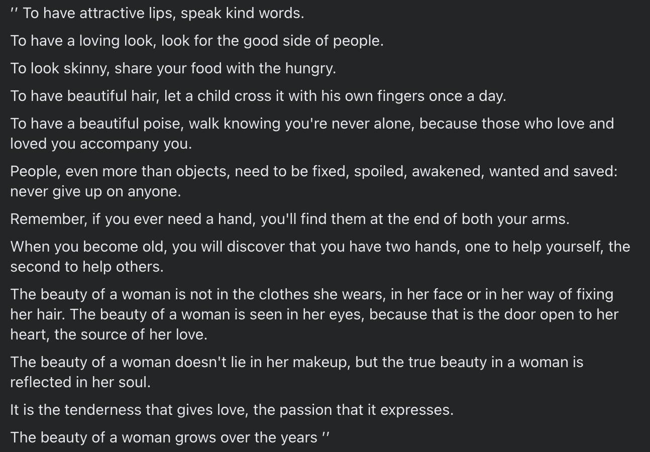 Shoutout to my dad for sending me this text called "The Beauty of a Woman" by Audrey Hepburn. Each time I read this, it gets all that much richer.