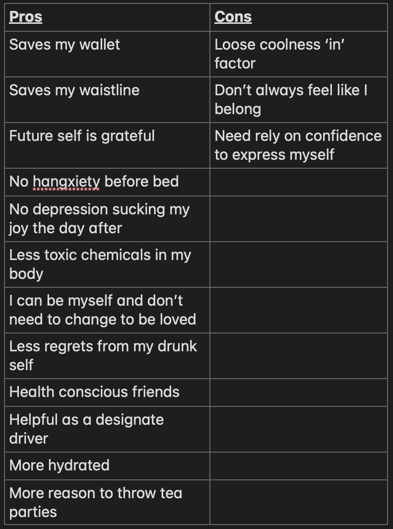 Drinking used to serve its purpose when I didnāt have the esteem or confidence to cultivate connections without it. But now, I am at a stage where always saying no is easier than sometimes saying yes. I am staying true to myself as someone who looks out for their mental and physical health. If I do not feel comfortable socializing with someone without booze, then maybe that is someone I prefer not to be friends with regardless. Iām glad I am not the only sober curious mind out there.