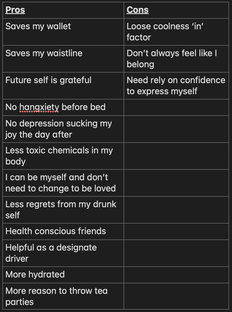 Sobriety is something worth my discomfort. Iād rather trade this coolness factor for control. I feel like people think I'm stiff but in reality, most people donāt actually think like that. My drinking behavior is not their concern. It is my business. This is about my relationship with myself. I dislike my past self for the past decisions of feeling like Hulk is in my head with my hangover the day after being drunk.