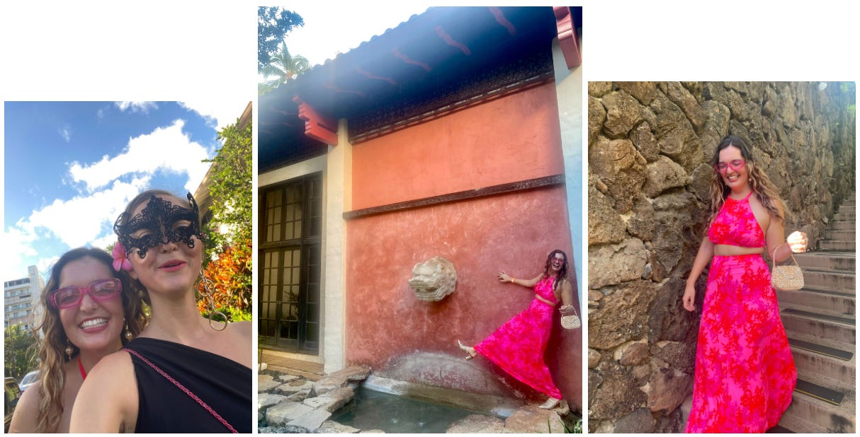 In the evening, I played dress up with my friend Hannah. I got to explore spontaneity with what to wear to the Halloween event at the Honolulu Museum of Art. I shifted away from being Rosie the Riveter to a woman in the 50s wearing a loud print. It made me feel vibrant and the most alive. Some might also call me a Hawaiian Barbie.