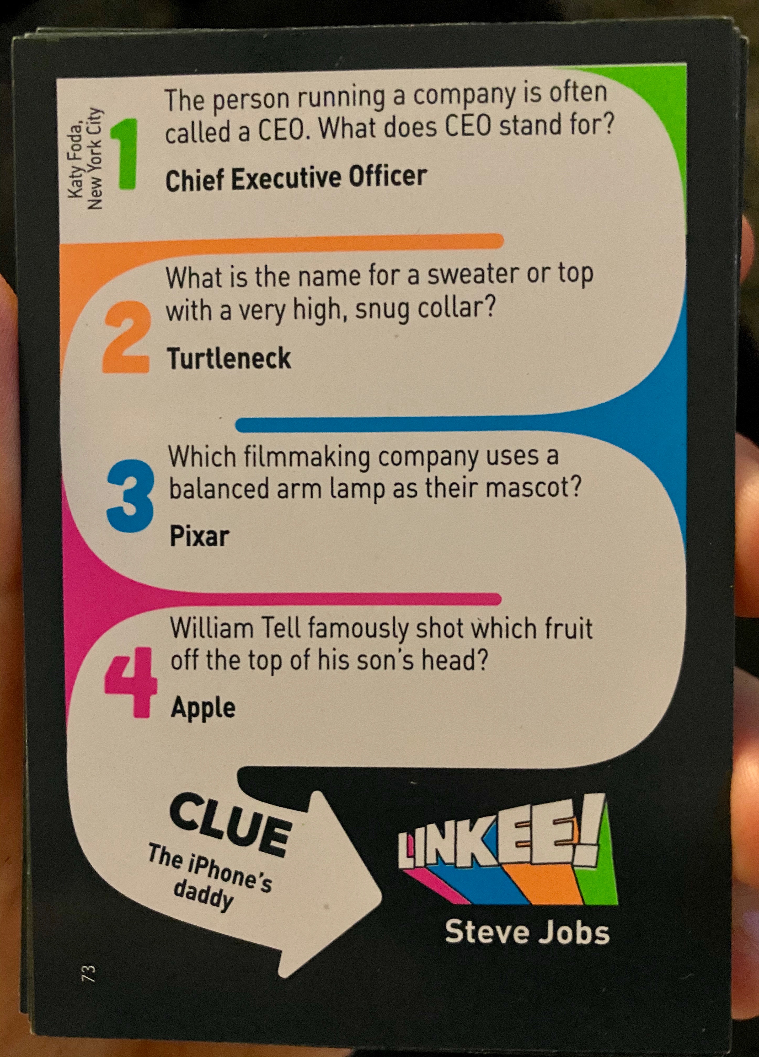 You only get one shot at shouting out the link. You need to trust your gut to use your one guess or hold off and risk the other team jumping in. It is an amazing feeling calling out the correct Linkee. Below is the first card I won. Notice how after the first two clues Steve Jobs popped into my head, but I wasn’t 100% sure until the 3rd clue that he was the link.