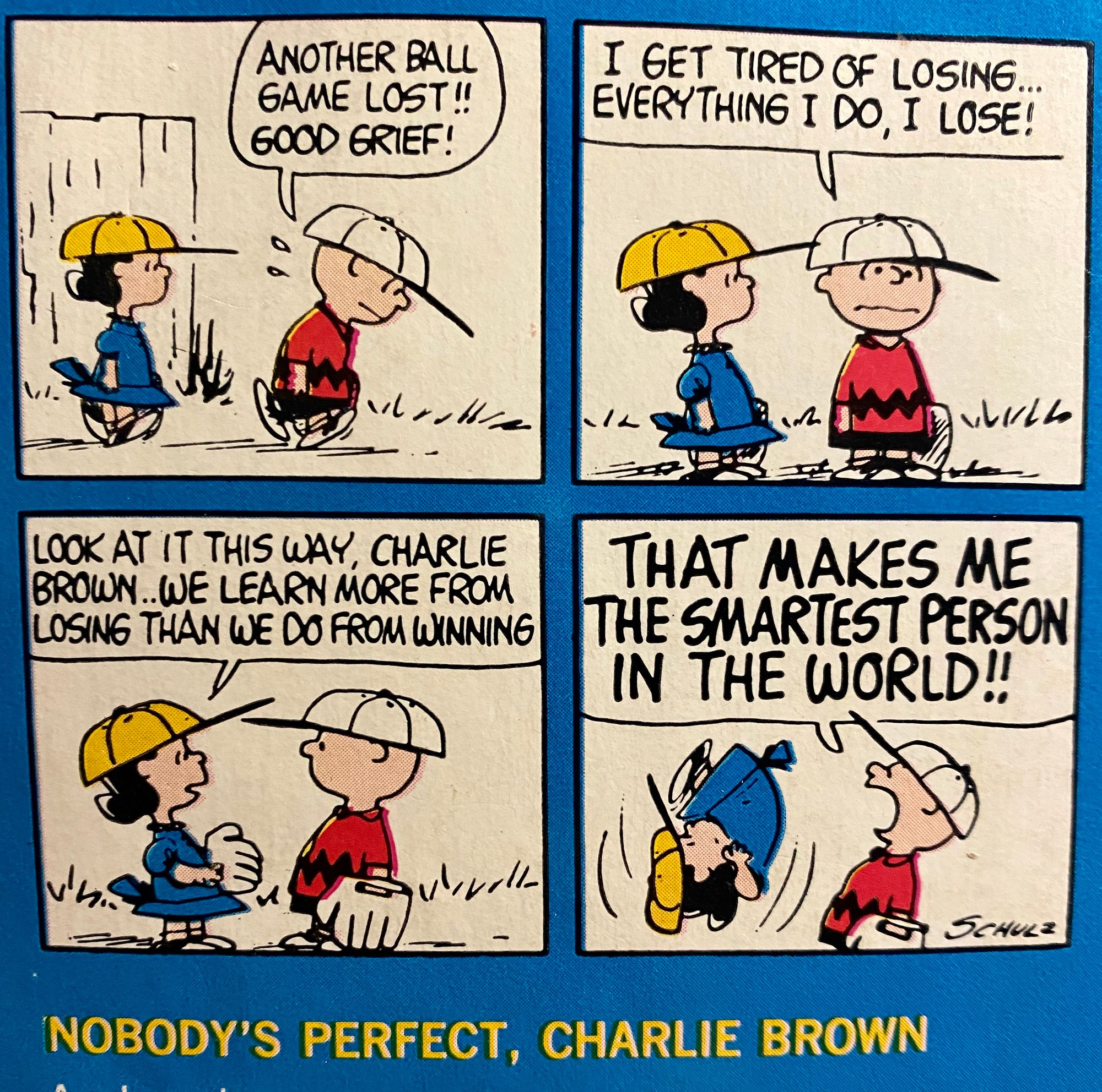 I came across an old comic book from my dad's bookcase. Nobody's Perfect, Charlie Brown Volume 1 comics written by Charles M. Schulz in 1969.