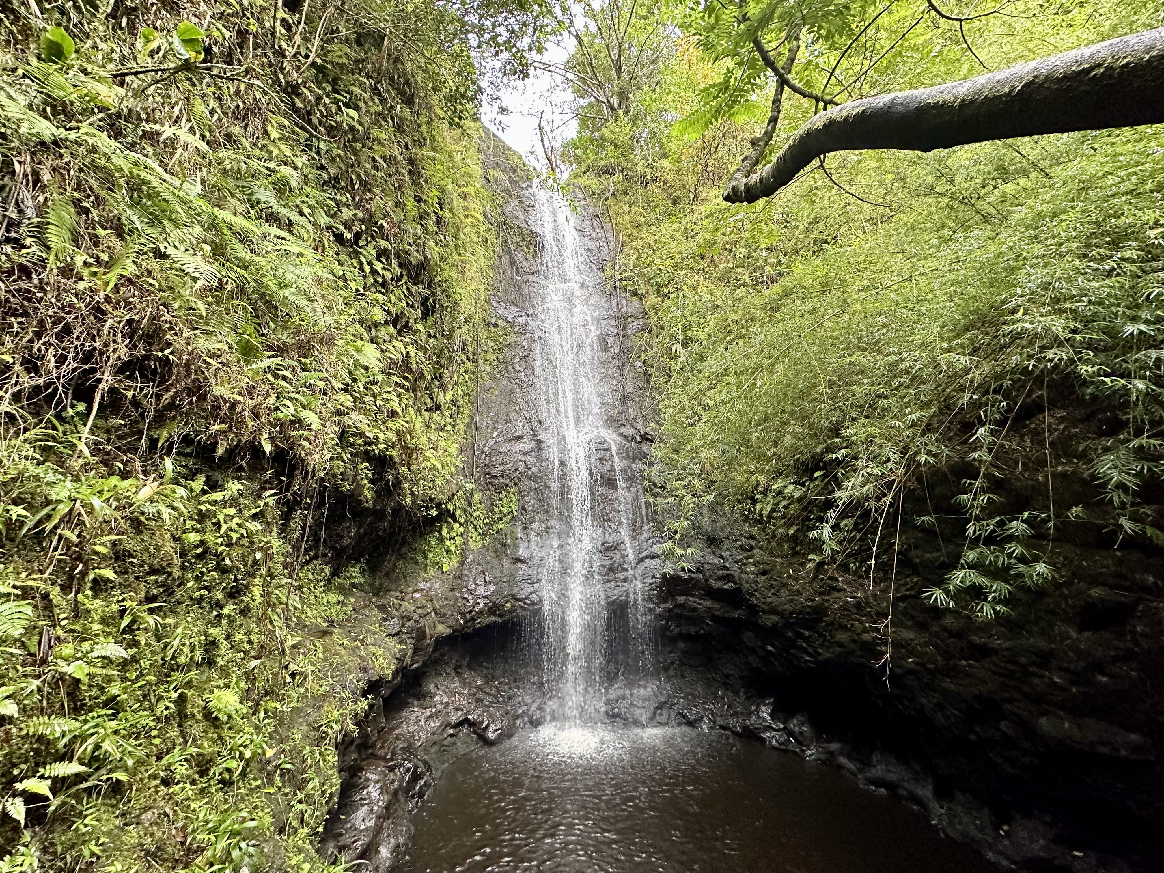 Greetings from a waterfall on the Ka’au Crater Trail on O’ahu, Hawai’i