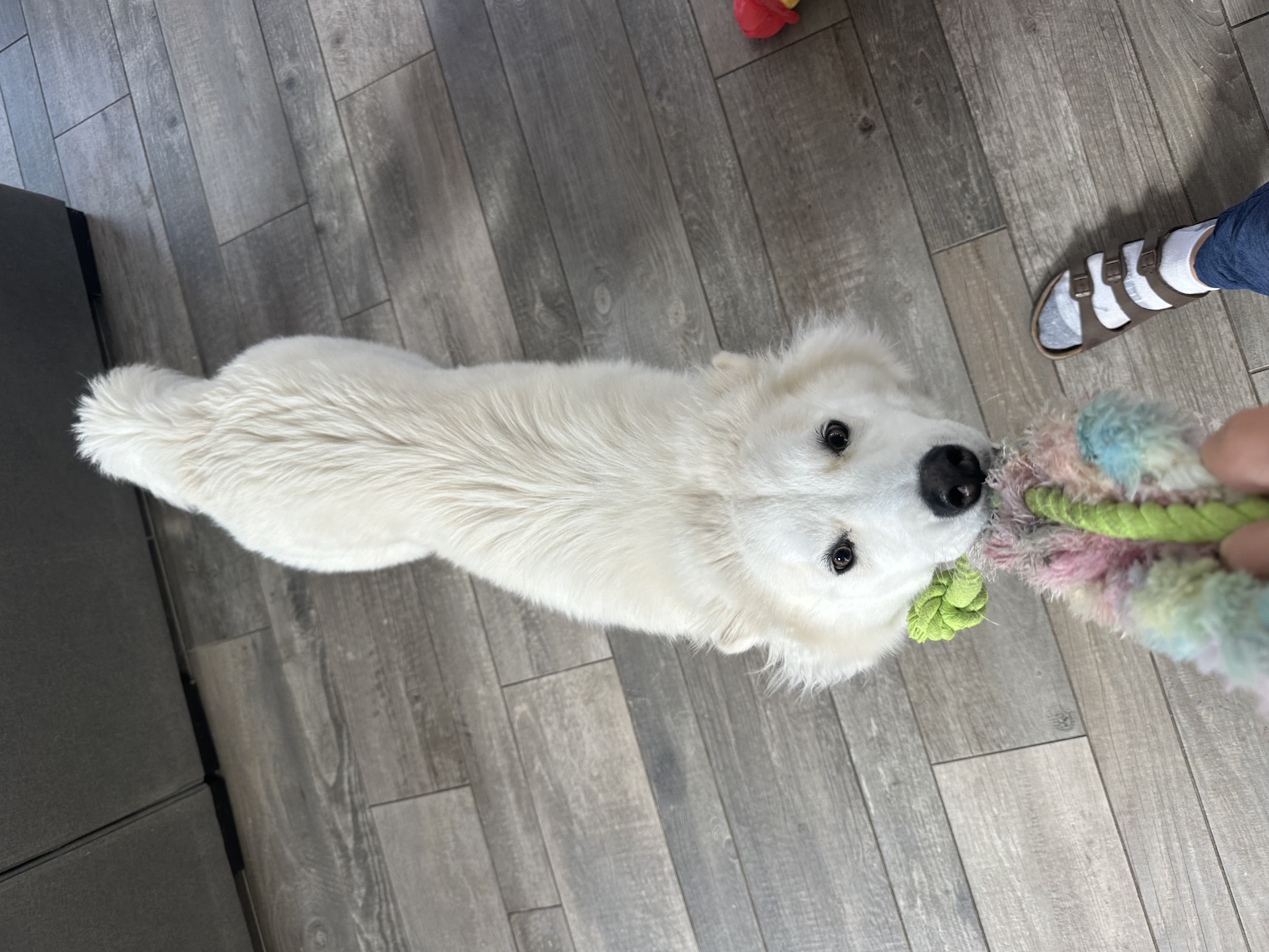 Sunset walkies with the mini Polar Bear doggy Layla.