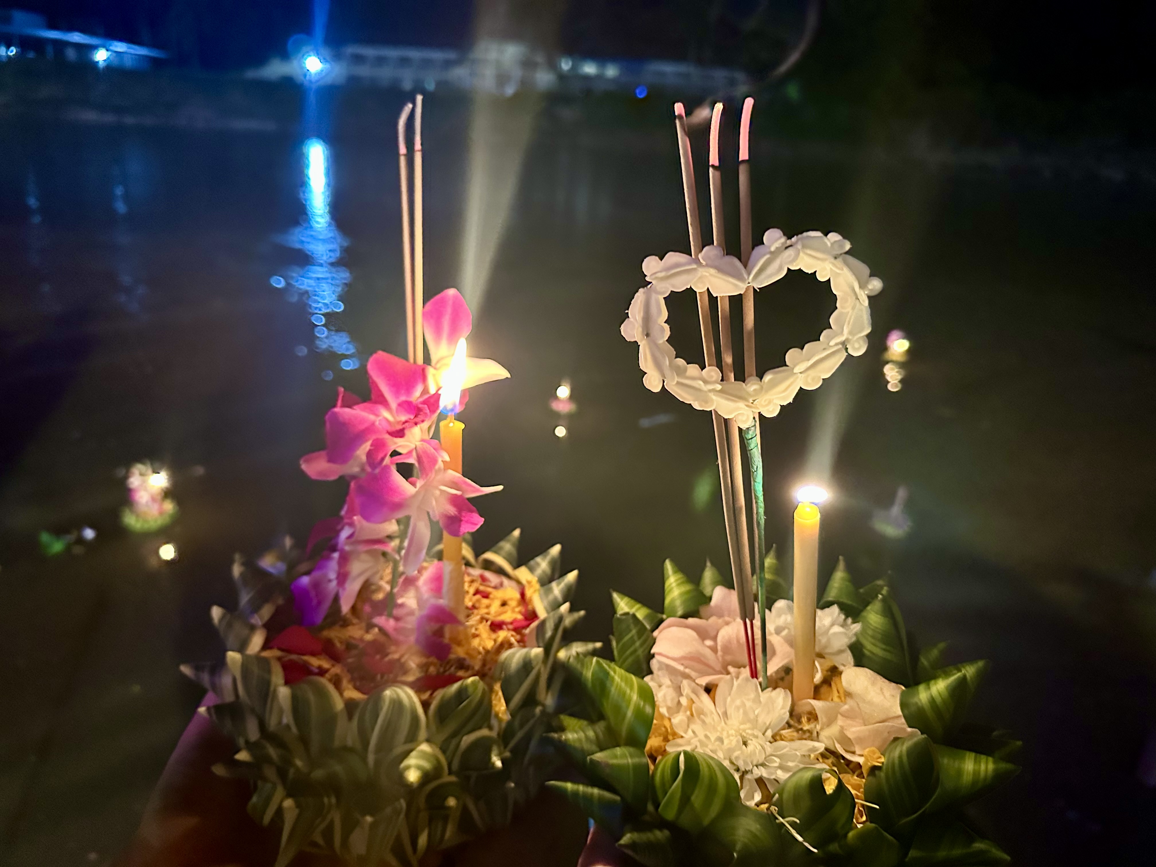 I hear fireworks currently popping off outside. They’ve been going for the past five hours. I just shared my evening with the whole high school I live at dancing in a circle with all my students with lit up lanterns and laughing all around. What a hoot that was. It’s Loy Krathong this weekend. A time to thank the water goddess and release flower offerings into the water. Here’s mine and Katherine’s from Thursday night: