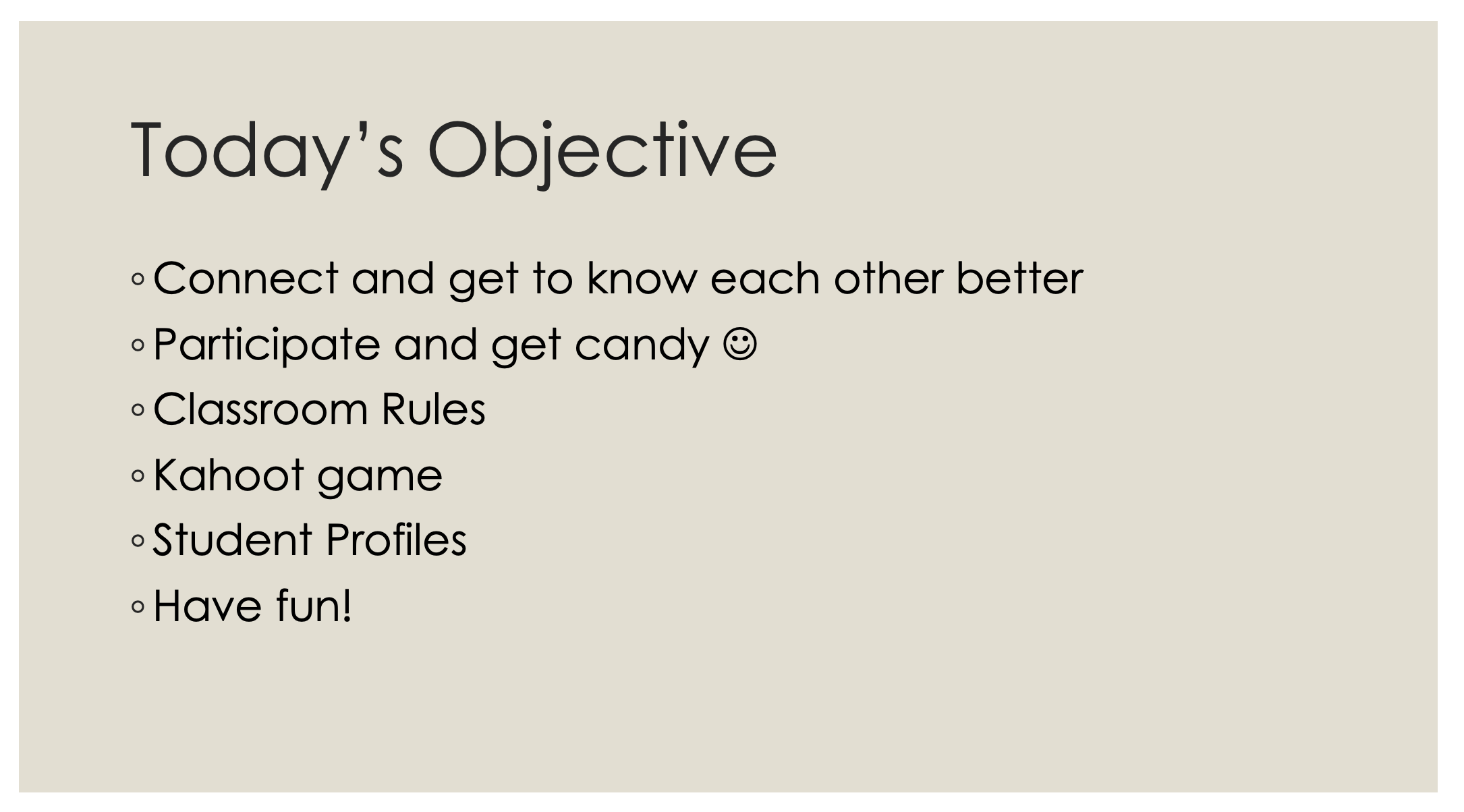 As I started my class, the HDMi chord wouldnāt connect. Thankfully, my co-teacherās computer would. So, on the fly, I uploaded my PowerPoint to Google Drive, emailed it to her, downloaded it on her computer (with slow Internet), and started class only 10 minutes behind schedule. On the class objective slide, I shared that students would win candy for participating, but I left the candy down in the foreign language teacher's officeāwhat a cruel joke. Being disheveled makes me absent-minded. Iām bringing them candy next week.