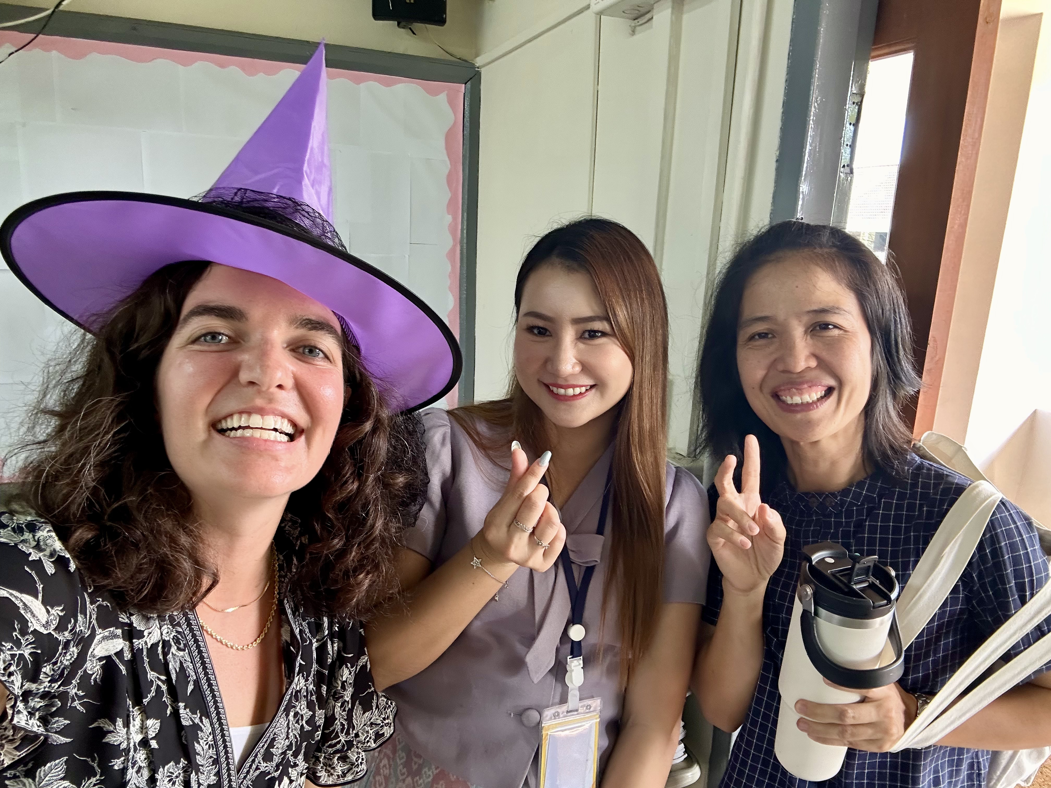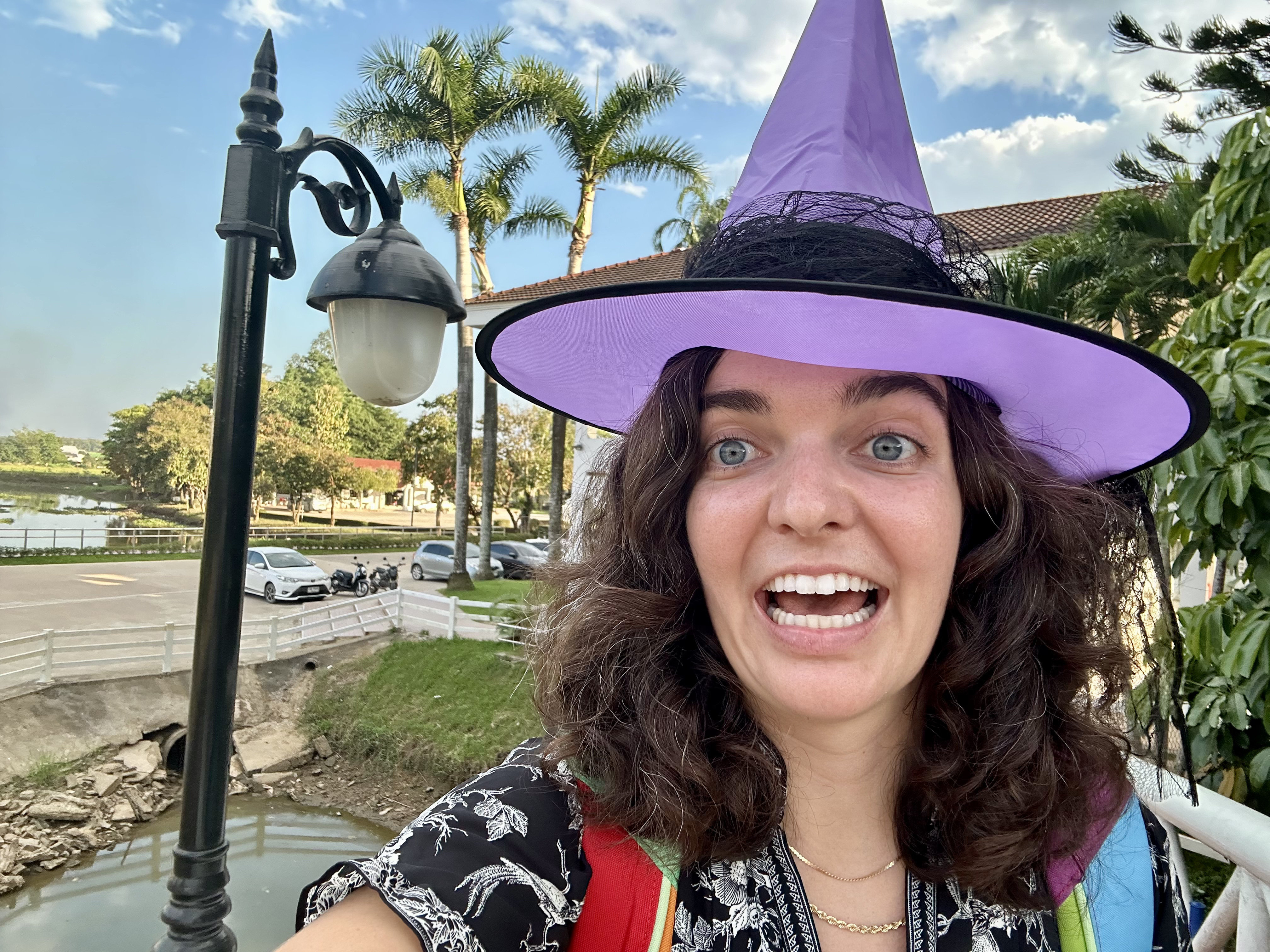 My first day of teaching was Thursday on Halloween, so naturally, when I was shopping at the mall the day before for home goods like linens, a Swiffer, and yoga mat, I bought 1500 baht of candy and a purple witch hat.