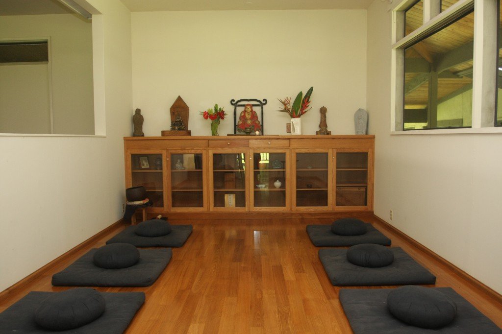Before stepping onto the stairs to enter, I was instructed by Jacobey to remove my slippers, like any other private residence in Hawaii. Next, I was given a tour of the meditation center, also known as a sangha. There was a Japanese tree in the back with roosters running around below it. The walls were all neutrally colored with brown wood. The zendo room, where the daily zazen practice takes place, is barren and hardwood-floored. The perimeter has square cushions six feet apart with round cushions on top of them to sit comfortably.